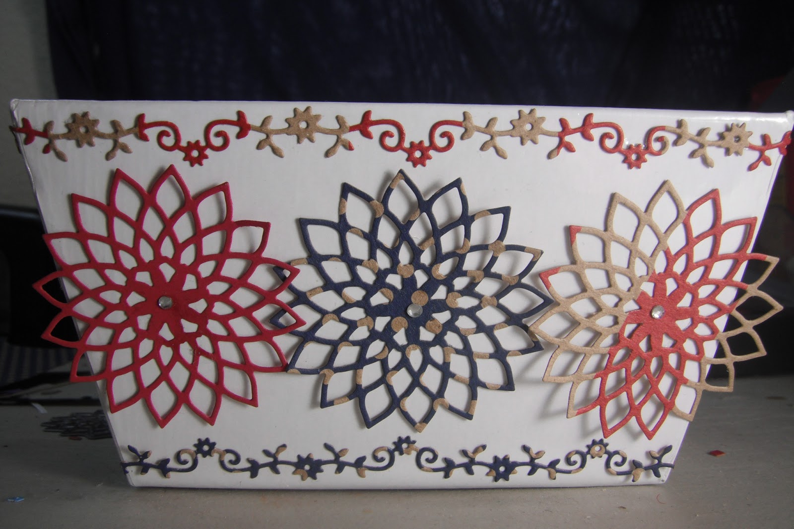 I purchased a $1 Chipboard Container from Target in their little $1 section in the front of the store, it's always filled with craft ideas and fun little things for the kids. I took my Crafty Little Designs Spiral Flower die and Flower Border die, and some flag like themed cardboard paper.